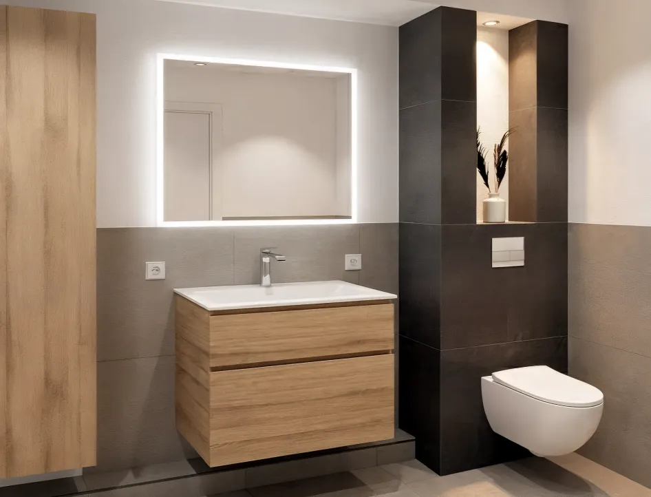 Ein weiteres Bild zeigt den Holzwaschtisch mit zwei Schubladen und den LED Spiegel. Die Toilette sitzt in einer anthrazitfarbenen Vorwand mit beleuchteter Nische. Das Zusammenspiel aus Grau und Holz schafft ein elegantes Gesamtbild.